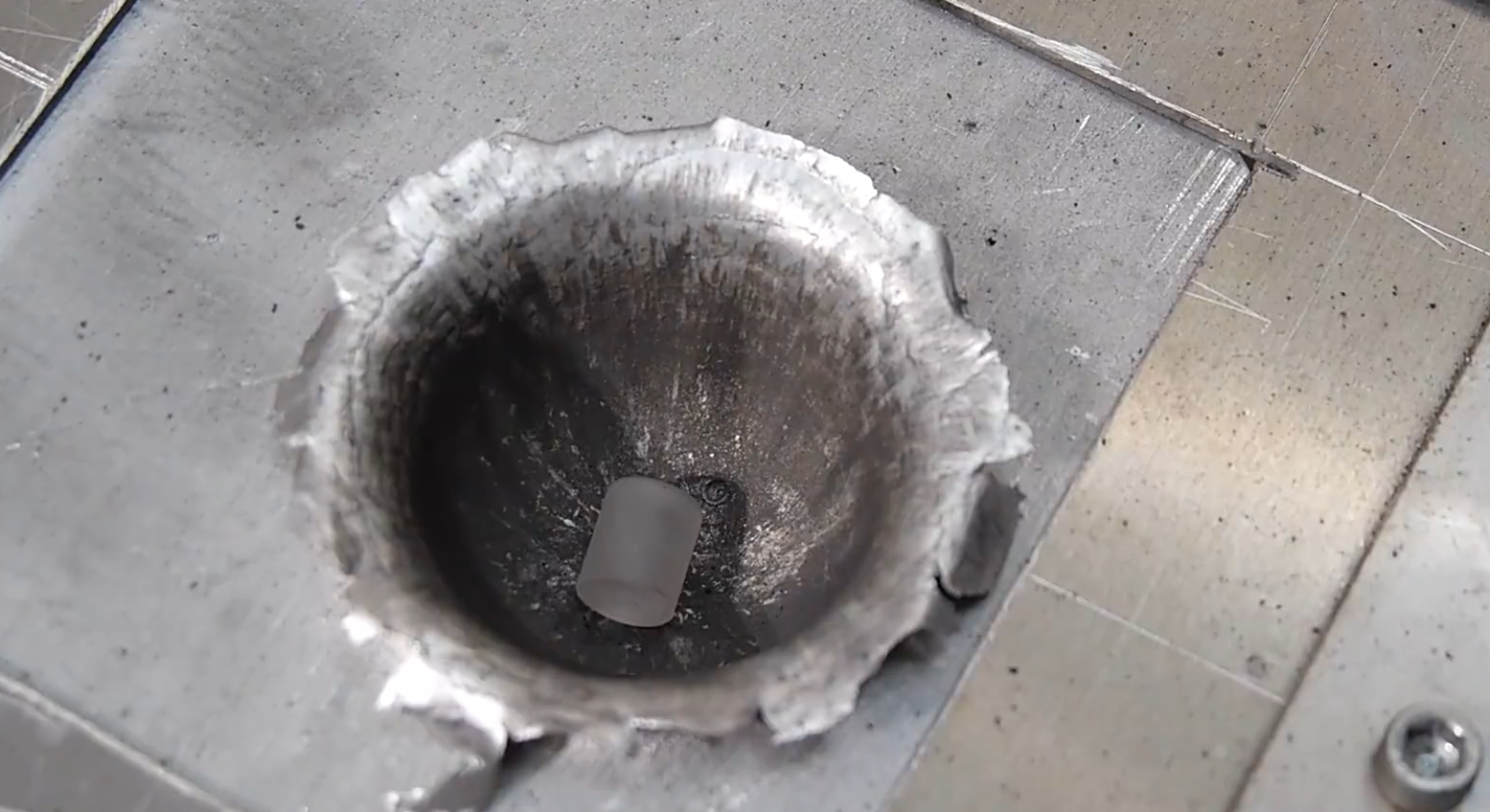 哈尔滨工业大学进行的模拟太空撞击实验中,一块“黄豆重”的塑料圆柱,以7公里/秒速度撞击70mm厚的坚硬铝锭,撞击处瞬间液化,之后快速冷却固化,产生一个直径是塑料柱5到6倍的光滑弹坑。
