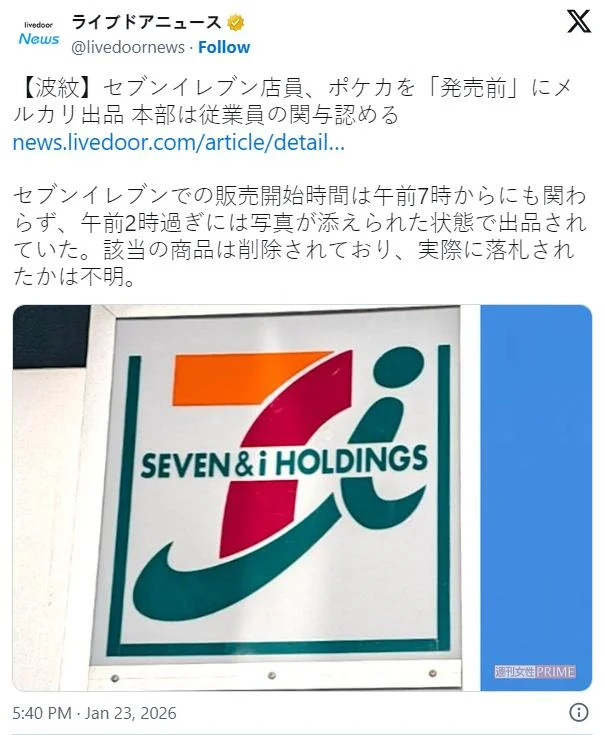 然而就在当天,日本社交平台 X(原 Twitter)上却突然炸锅——有玩家发现,在官方规定的开卖时间之前,疑似有便利店员工已经提前把商品拿去二手平台上架出售。
