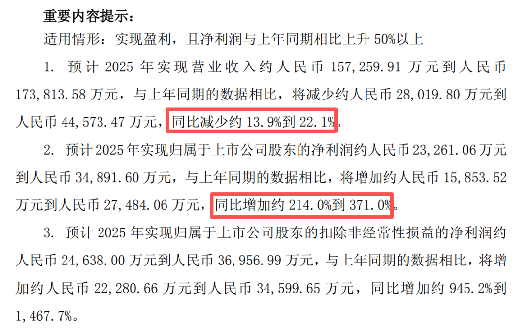 1月21日,公司发了个“业绩预喜”公告,2025年收入预计减少13.9%-22.1%,但净利润增长214%-371%。