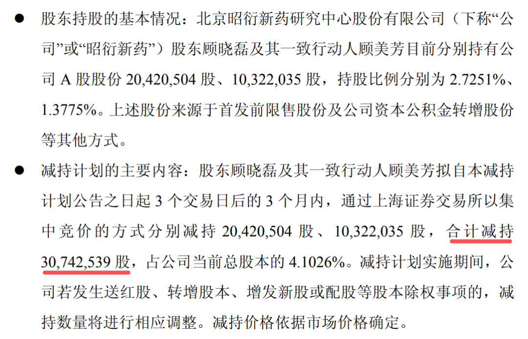起因是周日晚间,昭衍新药公告,第四大股东顾晓磊和第七大股东顾美芳(姑侄关系)打算清仓,把手里3074万股全抛了,占总股本4.1%。清仓理由,就6个字——自身资金需求。