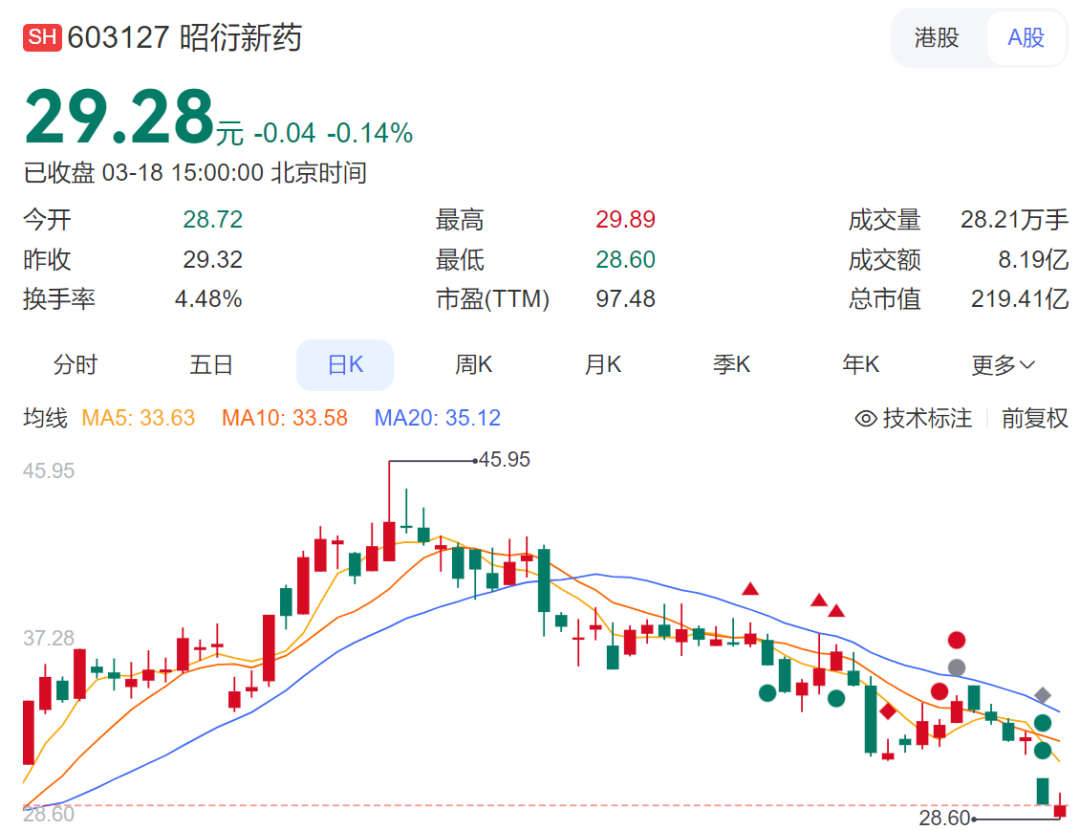 3月17日周一,昭衍新药A股跌停,H股跌11.7%。暴跌之后,股价已较年初高点近乎腰斩。
