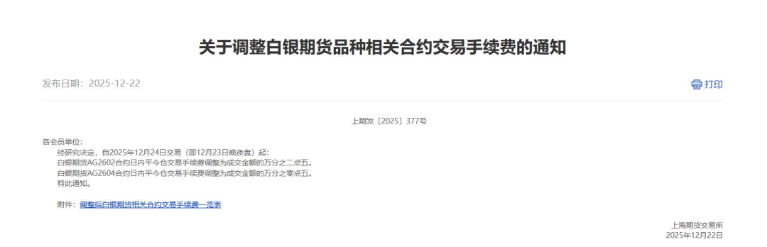 在另一条公告中,上期所还对白银期货相关合约交易手续费做出了调整。上期所公告表示,自2025年12月24日交易(即12月23日晚夜盘)起,白银期货AG2602合约日内平今仓交易手续费调整为成交金额的万分之二点五。白银期货AG2604合约日内平今仓交易手续费调整为成交金额的万分之零点五。