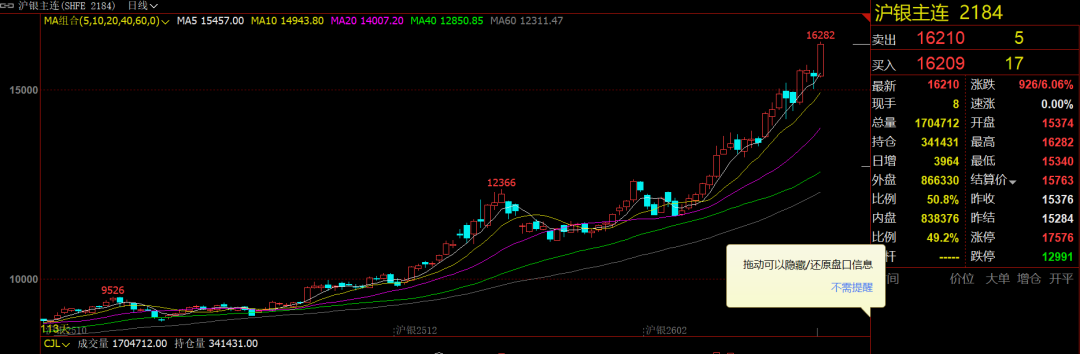 国信期货首席分析师顾冯达指出,上期所此次对白银期货AG2602合约实施日内开仓量限制,是其在价格持续飙升、市场交易活跃度显著提升的背景下,出于防范风险、抑制过度投机的考虑所采取的一项针对性措施。