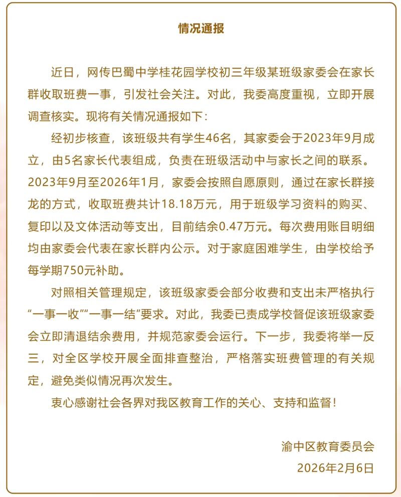 2月6日下午,重庆市渝中区教育委员会发布《情况通报》称,近日,网传巴蜀中学桂花园学校初三年级某班级家委会在家长群收取班费一事,引发社会关注。对此,我委高度重视,立即开展调查核实。现将有关情况通报如下:经初步核查,该班级共有学生46名,其家委会于2023年9月成立,由5名家长代表组成,负责在班级活动中与家长之间的联系。2023年9月至2026年1月,家委会按照自愿原则,通过在家长群接龙的方式,收取班费共计18.18万元,用于班级学习资料的购买、复印以及文体活动等支出,目前结余0.47万元。每次费用账目明细均由家委会代表在家长群内公示。对于家庭困难学生,由学校给予每学期750元补助。对照相关管理规定,该班级家委会部分收费和支出未严格执行“一事一收”“一事一结”要求。对此,我委已责成学校督促该班级家委会立即清退结余费用,并规范家委会运行。下一步,我委将举一反三,对全区学校开展全面排查整治,严格落实班费管理的有关规定,避免类似情况再次发生。