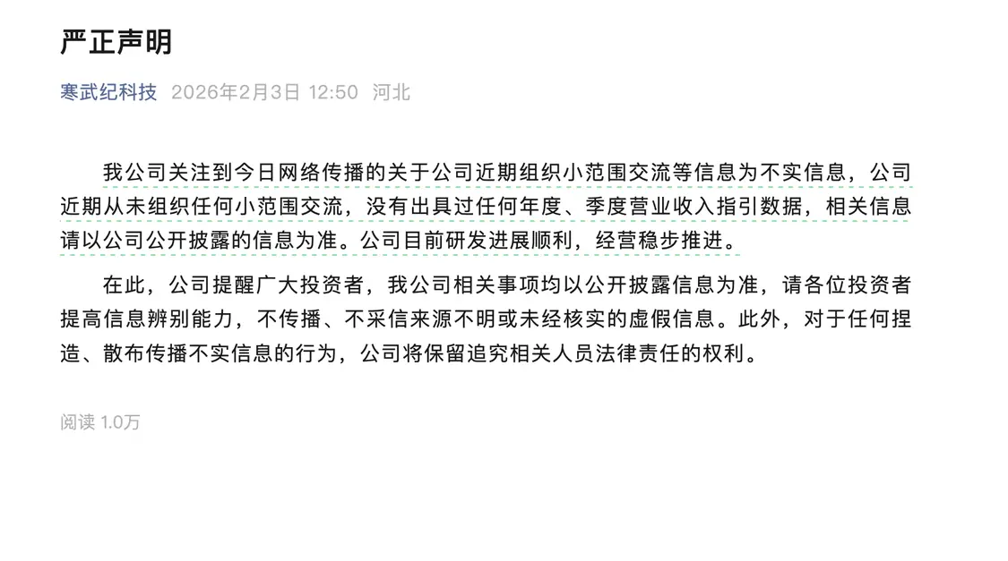 2月3日,寒武纪-U(SH688256)盘中大幅跳水,截至中午休市股价跌近13%,总市值回落到4500亿元左右,蒸发超700亿元。官方工作人员表示:“市场上很多的传闻,这肯定都是假的。然后二级市场资金、情绪的波动还是比较多的,大家理性对待。”