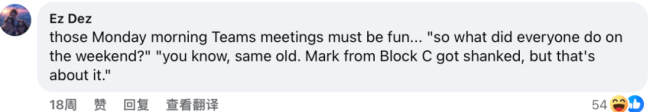 “周一早上的团队会议肯定很有趣……‘大家周末都干嘛了?’‘老样子,跟以前一样。C区的马克被捅了一刀,也就这事儿了。’”
