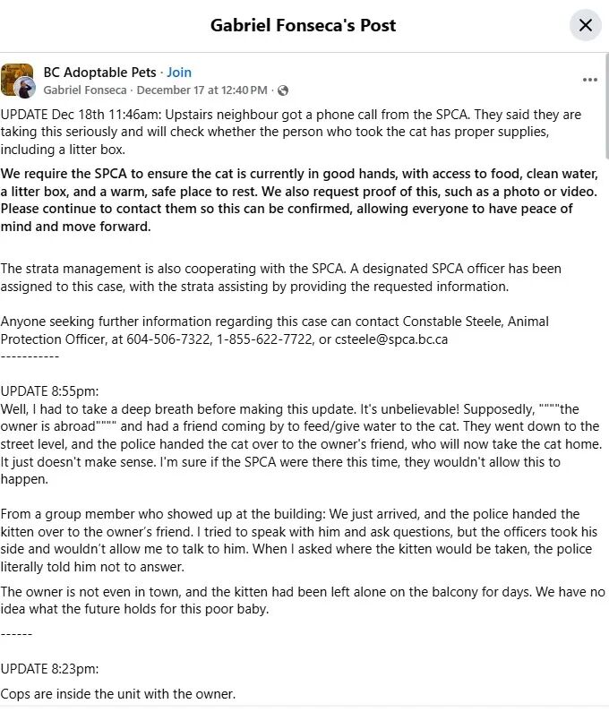 Wolf 表示:“目前可以确认,这只曾在阳台上的猫咪已有照料,虽然不是由 BC SPCA 直接照料”。