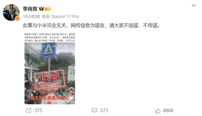 11月23日,小米汽车副总裁李肖爽通过微博辟谣“小米M7车祸致8人死亡”称,此事与小米完全无关,网传信息为谣言。
