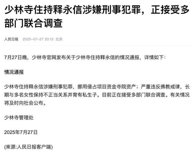 昨天晚上,不少官方媒体都出来报道:少林寺住持释永信涉嫌刑事犯罪,挪用侵占项目资金寺院资产;严重违反佛教戒律,长期与多名女性保持不正当关系并育有私生子。目前正在接受多部门联合调查。