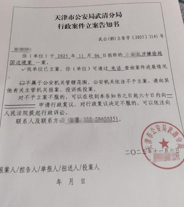 记者获得的一份立案告知书显示,王某凯因涉嫌偷越国边境一案,天津市公安局武清分局某派出所已立案。