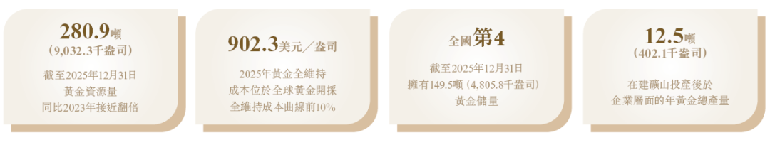 截至2025年12月31日,山金国际的黄金资源量达到280.9吨(9,032.3盎司),对比截至2023年12月31日的146.7吨(4,715.3盎司)接近实现了翻倍。截至2025年12月31日止年度,山金国际的黄金全维持成本为902.3美元/盎司,位于全球黄金开采全维持成本曲线前10%,而同年全球平均数为1,585.8美元/盎司。