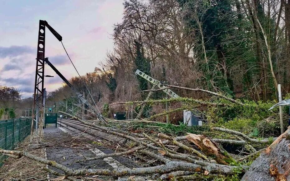 巴黎大区本周末交通受“戈雷蒂(Goretti)”风暴重创:RER D线科尔贝伊-埃松(Corbeil-Essonnes)至默伦(Melun)段全线停运,因沃夫(Vosves)站附近大树倒塌压垮接触网,八站无车至少至周日深夜,或延至周一早。SNCF Réseau称“工程极重”。