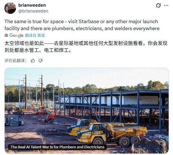 还有人把视野投向AI领域之外的太空,建议人们去SpaceX的发射场看看,那里全是水管工、电工和焊工。