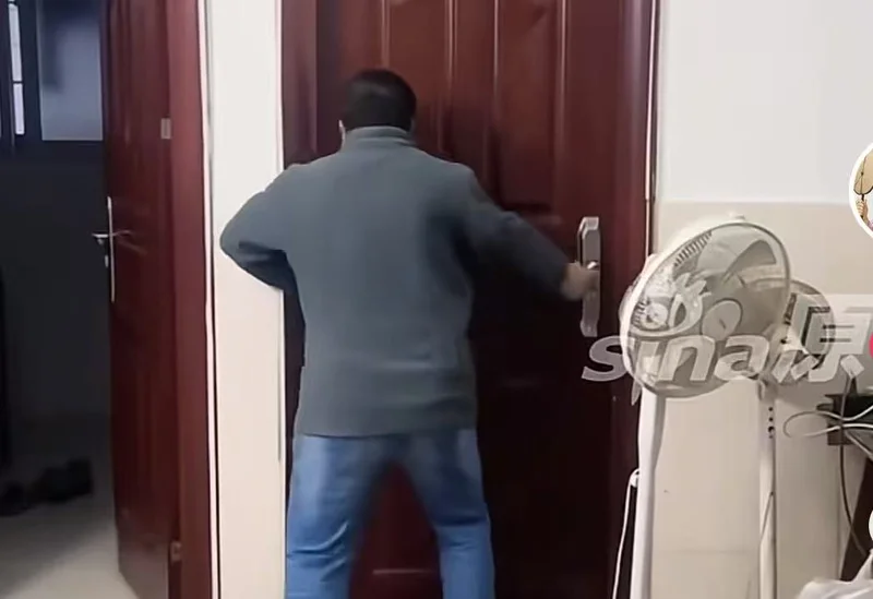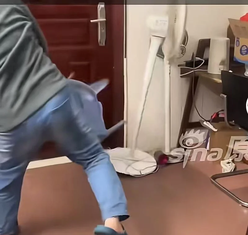 先是疯狂晃动房间的门把手,打不开就上脚踹,踹不开拎起旁边的椅子,就往门上狠狠砸去。