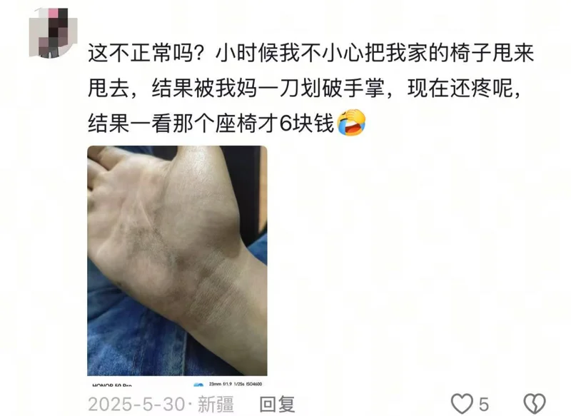 “小时候把我家椅子甩来甩去,被我妈一刀划破手掌,现在还疼呢”