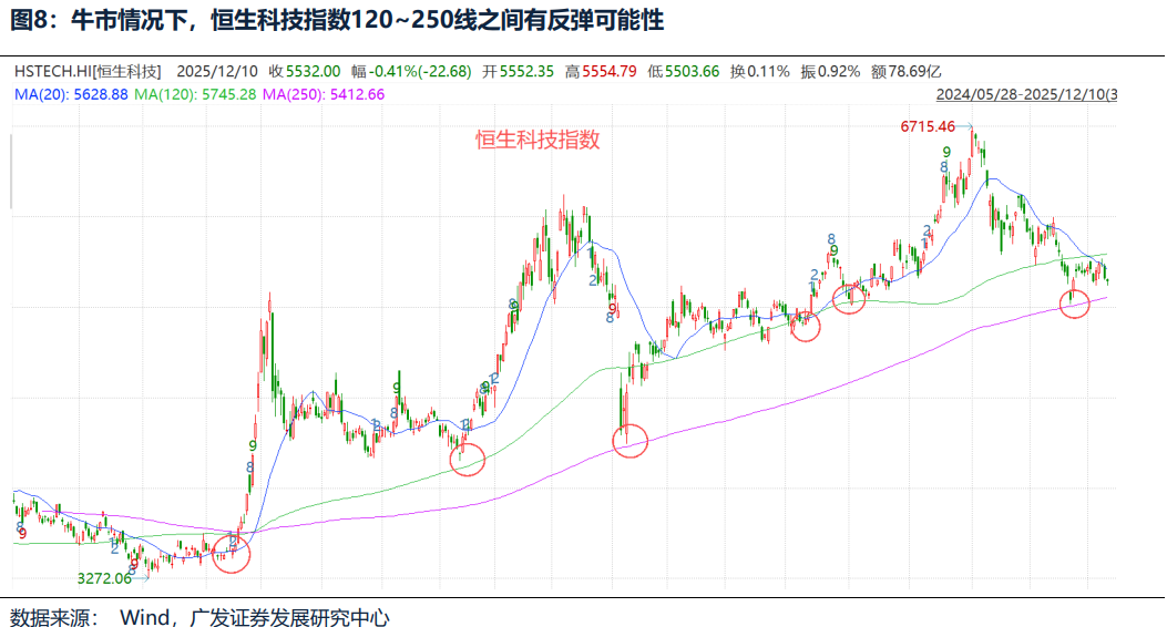 广发证券发布研报称,港股对外围风险更敏感,美联储未来降息路径不明,以及港股12月面临限售股解禁高峰、分子端基本面承压,所以更容易受到流动性的冲击。该行预计潜在反弹时间点可以关注12月中下旬、明年1月初。技术面,在牛市情况下,恒科跌破120日均线,说明下跌动能释放已经比较充足,在120~250日均线之间随时有反弹可能性,截至12月9日,距离250日均线只差2.7%。