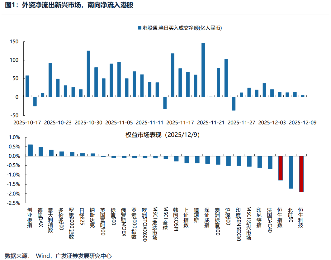 因为川普不满鲍威尔降息表述,市场预期下一任联储主席是鸽派的,目前最有可能担任主席的哈赛特,周一晚间表述:不能提前公布未来六个月利率政策;应该紧盯经济数据,适度、谨慎的下调利率。这和市场的鸽派预期差异太大,所以外资净流出新兴市场,作为一个验证,可以看到印尼、印度、新兴市场等跌的较多,而南向是净流入港股的。