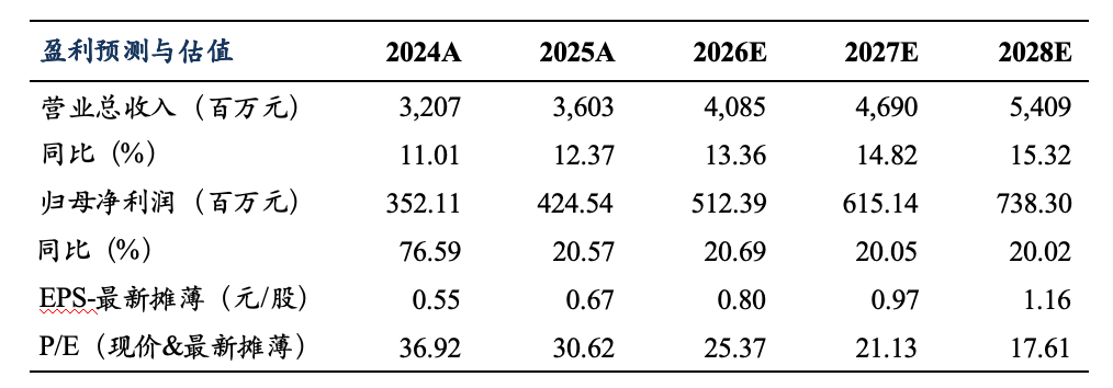 考虑到公司战略新兴板块快速增长,我们预计公司2026-2028年归母净利润分别为5.1(原值5.0)/6.2(原值5.9)/7.4亿元,当前市值对应PE分别为25/21/18X,维持“增持”评级。