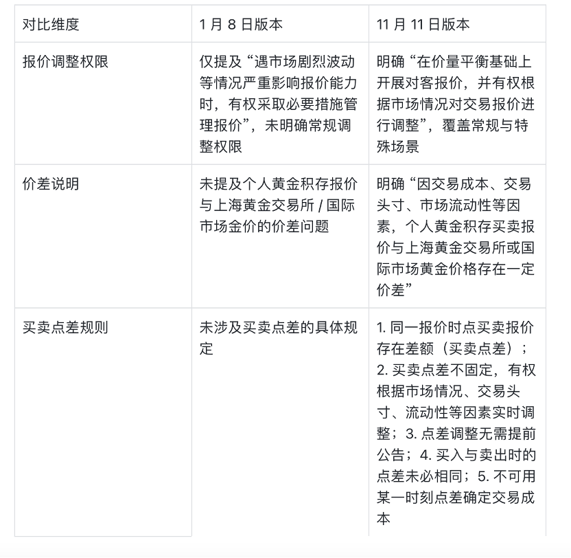 本次规范从五个维度对点差执行规则进行了细化,具体为:同一报价时点,个人黄金积存买卖报价之间存在一定差额(即买卖点差);买卖点差不固定,中国建设银行有权根据市场情况、交易头寸、流动性等因素实时调整买卖点差;不再就点差调整进行提前公告;客户买入黄金积存份额时的买卖点差和卖出时的买卖点差未必相同;客户不能使用某一时刻的买卖点差来确定其交易成本。明确巨额赎回中的“净赎回”概念