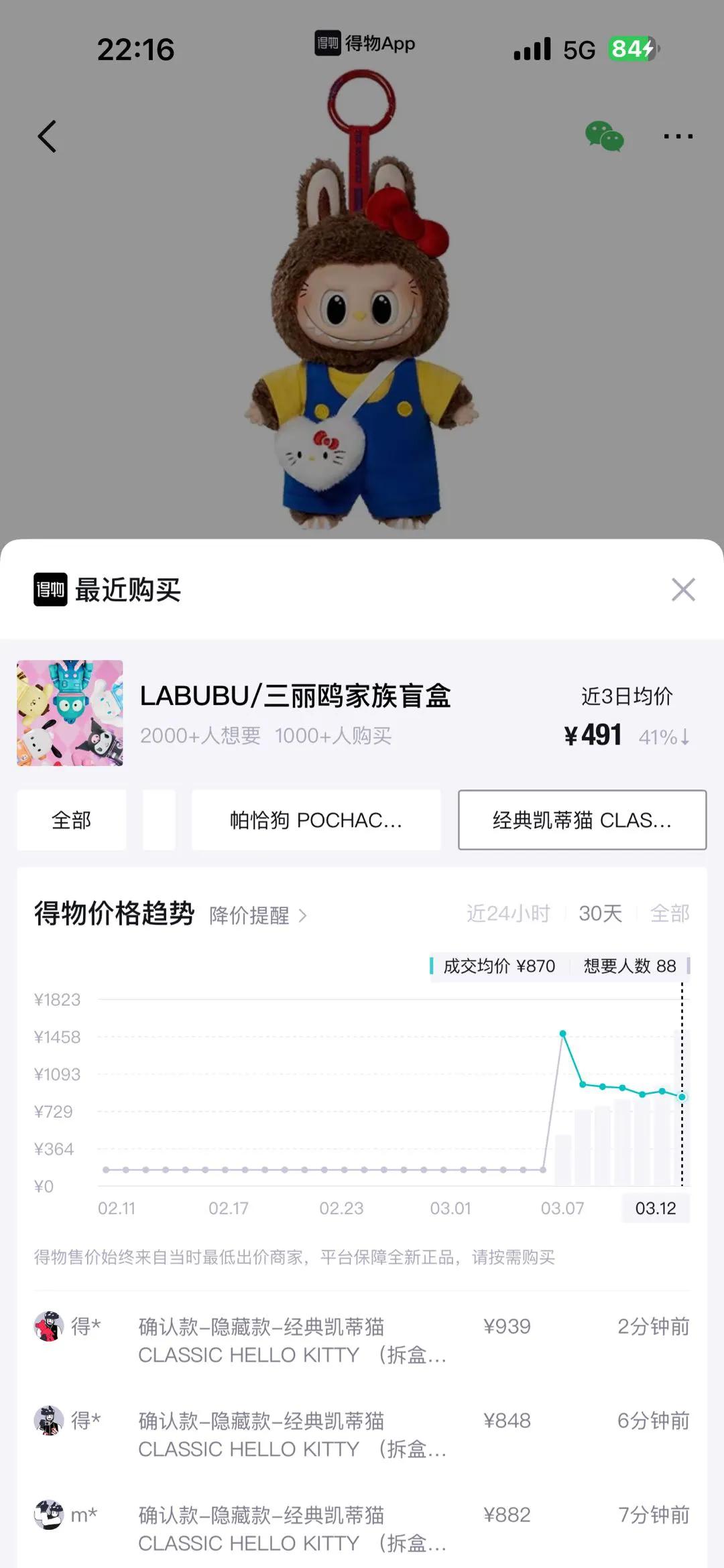 得物App数据显示,隐藏款“经典凯蒂猫”市场成交价由159元上涨至最高1490元,溢价8.4倍,此后平稳回落,当前市场成交价为847元,溢价4.3倍;常规款中“凯蒂猫”更受欢迎,市场成交价由159元上涨至最高430元,溢价1.7倍;库洛米、美乐蒂等其他常规款价格在270元至320元。