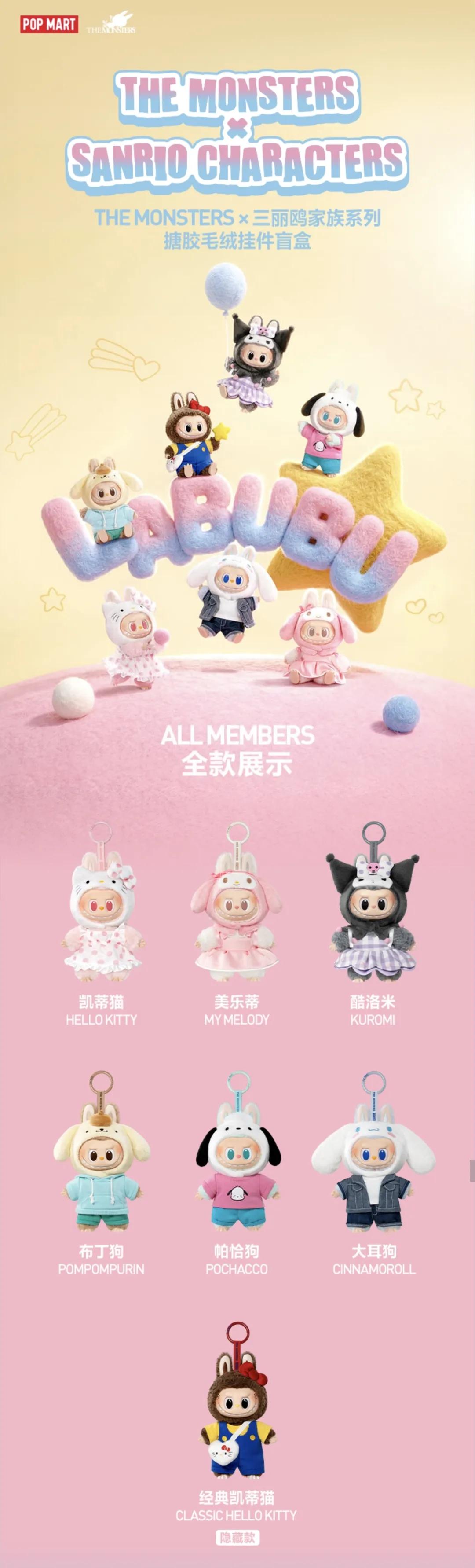 据悉,此次LABUBU联名三丽鸥盲盒共推出7款角色,含6款普通款与1款隐藏款,设计上以LABUBU经典造型搭配凯蒂猫、库洛米、美乐蒂等三丽鸥经典IP的专属服饰,单个盲盒售价159元,整盒定价954元,其中隐藏款出现概率为1:72。线下门店3月13日正式上架。