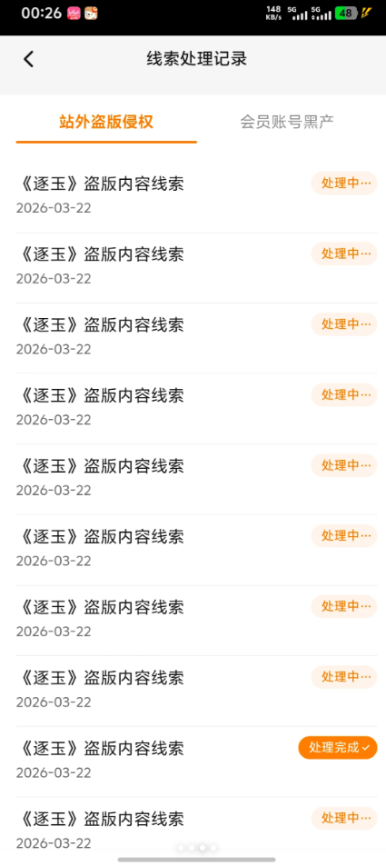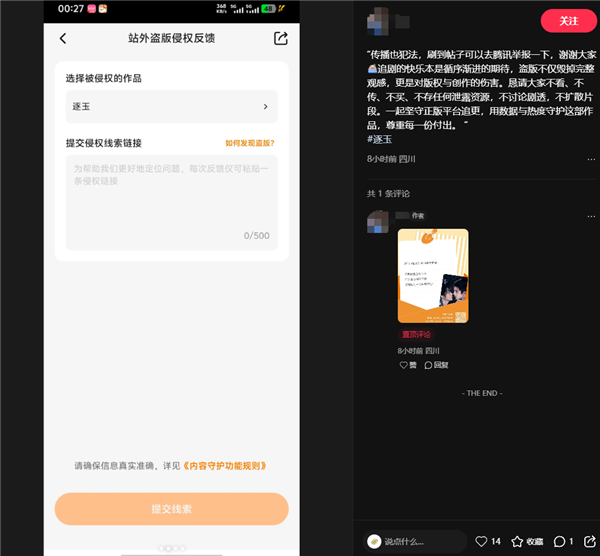 腾讯视频App显示,腾讯视频可反馈《逐玉》盗版线索,截稿前,部分网友反馈的《逐玉》盗版线索已被处理。