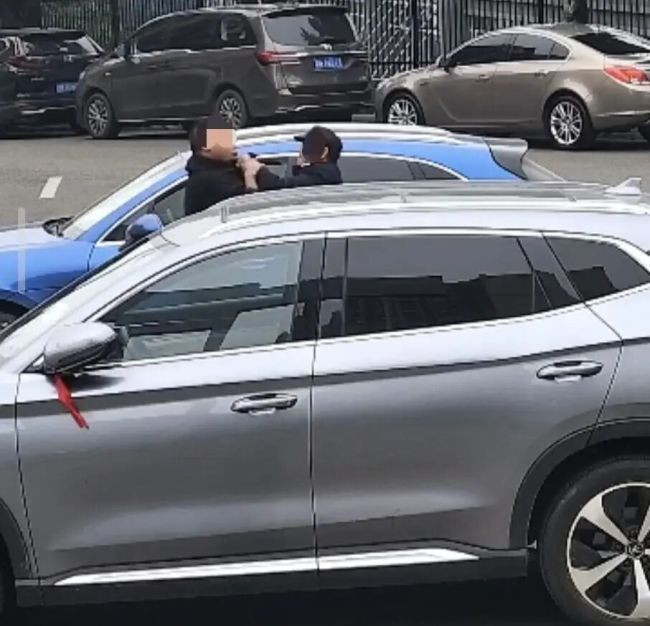 监控显示,一辆蓝色SUV停在路边的人行道上,当天8时许,一男子骑着共享电单车来到车旁,疑似将车筐内的物品转移到SUV车厢内。随后,他将电单车停放后,又返回SUV旁。男子在车旁抽烟时,一名保安赶来与其理论并发生抓扯。在保安呼叫增援时,男子挣脱驾车逃离现场。