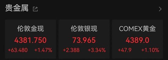 贵金属方面,现货黄金突破4380美元/盎司,涨超1.4%。现货白银日内一度涨超3.5%,突破74美元/盎司。