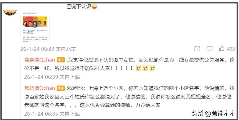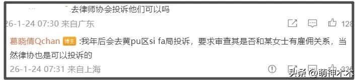 而孙律师与张雨绮是否认识?葛晓倩也已经有了对策,她表示年后会去司法局投诉,要求彻查两人是否有雇佣关系,而且律协也可以投诉。对于艾特辽宁卫视的刷屏抵制,葛晓倩也建议大家冷静理智,表示相关账号基本都是外包,不要为难打工人。