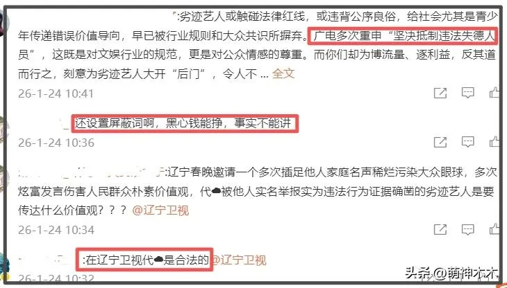任意打开辽宁卫视官博的一条评论区,都能看到于适粉丝刷屏抵制张雨绮的消息,基本概括为“插足小三、炫富、代孕”等,并强调广电要求“坚决抵制违法失德人员复出”的概要,指责辽宁卫视包庇劣迹艺人,为了流量伤害公众情感,目前辽宁卫视并未回应是否删除张雨绮的节目,只是关闭了评论区,并设置了屏蔽词。