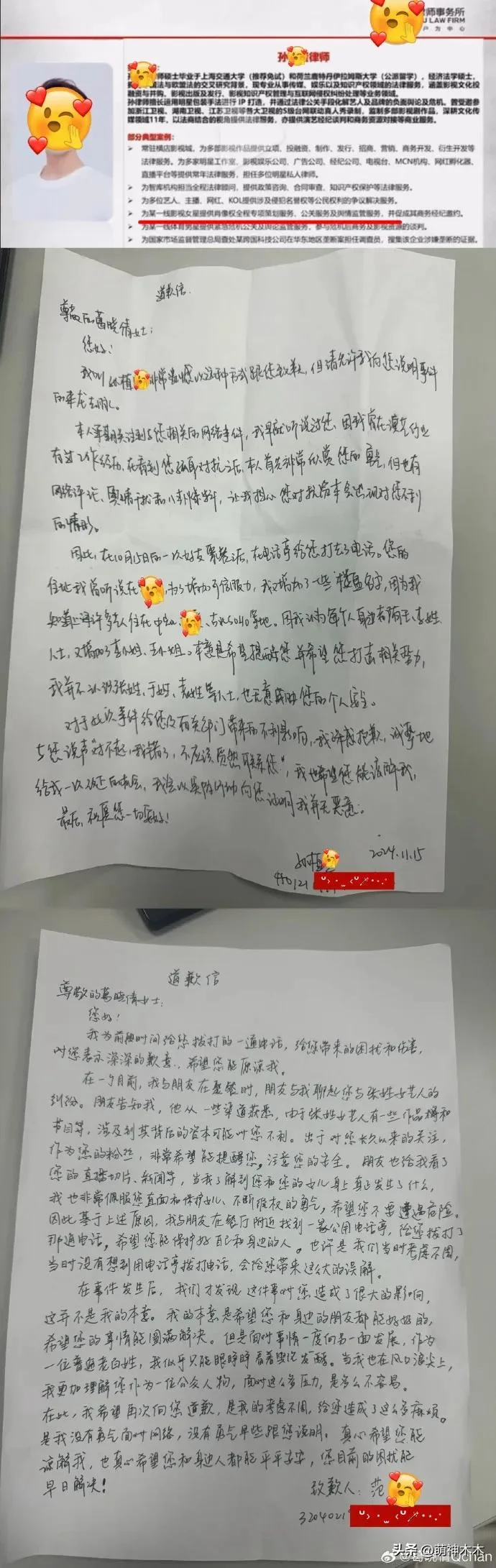 从葛晓倩晒的两位律师道歉信来看,他们都承认了拨打电话的行为,为此造成的伤害道歉,但诉说理由的时候纷纷表示不认识张女士,称给她拨打电话的用途则是想为她分担解忧,还自称是关心过度的粉丝,故而做出了一些贸然的行为,而获取电话的途径则是通过楼盘信息。