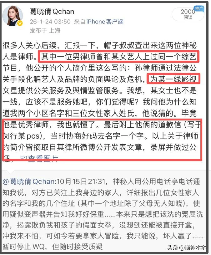 葛晓倩第一篇诉说结果的文章发布时间是凌晨3点,但发布没多久后被屏蔽了,她又重新截图发文询问大伙儿是不是能看得见, 并重申当时威胁打电话的人是俩律师。