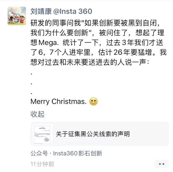 12月24日,刘靖康在其个人社交账号发文,对近期公司新品遭遇网络恶意攻击事件作出公开回应。他在转发公司悬赏公告时配文称:“高调的人光明正大地阴阳,低调的人在隐秘的角落里捅刀子。”并引用了“karma is a bitch”(意为“因果报应”)的英文俚语及小说《哈利·波特》中反派角色伏地魔的本名“Franklin Marvolo Riddle”。