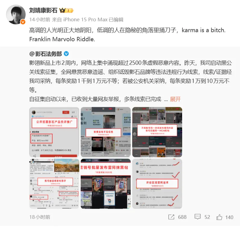 此前,影石法务部发布公告。公告称,公司新品上市两周内,网络上集中涌现超过2500条虚假恶意内容。为此,公司决定启动黑公关线索专项悬赏征集,对提供“恶意造谣、组织毁坏影石品牌”等行为有效线索的个人或组织予以奖励,奖励金额从1000元至10万元不等。具体奖励标准为:线索或证据一经公司采纳,每条奖励1000元至1万元;若后续被公安机关采纳,每条奖励将提高至1万元至10万元。