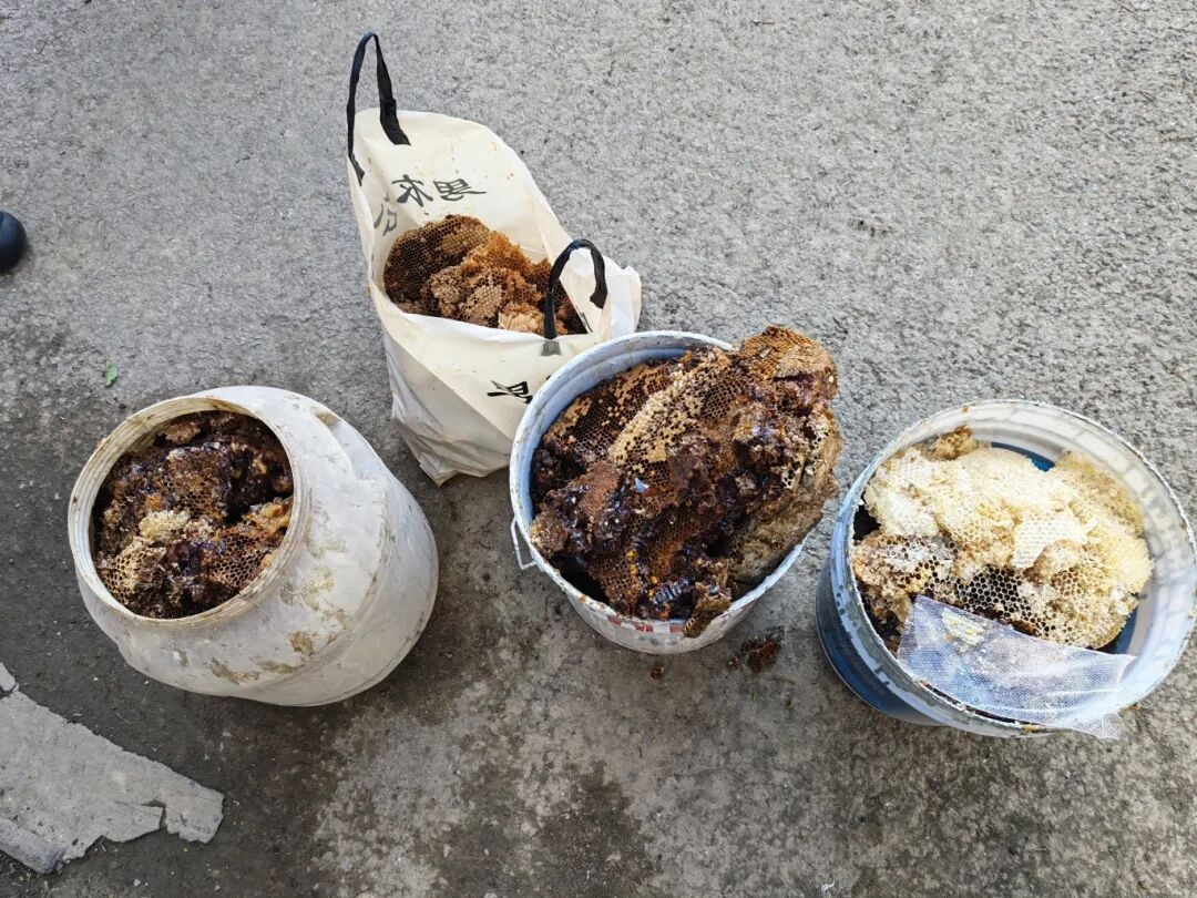 消防员先用药剂对蜂巢进行喷洒处理,再用工具一点点将蜂巢剥离拆除。整个清理过程持续了不短的时间,最后拆下来的蜂巢体积庞大,三个大桶和一个袋子才能完全装下。