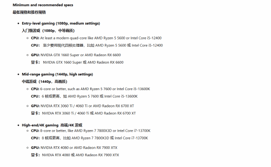 在这份推荐指南中,微软建议入门级配置采用AMD锐龙5 5600或英特尔酷睿i5-12400级别的处理器,搭配英伟达GTX 1660级别的显卡;中端配置则包含锐龙5 7600处理器和RTX 3060 Ti显卡;而在微软看来,高性能系统需要锐龙7 7800X3D级别的处理器以及RTX 4080级别的独立显卡。