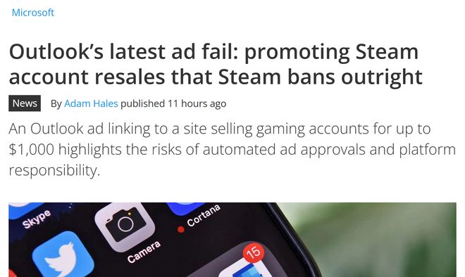 针对 Outlook 中的广告来源与审核,微软在其 “About ads in Outlook” 支持页面中曾作出说明,免费版 Outlook 的广告由 Microsoft Audience Network、Meta Audience Network 等广告网络投放,广告主通过相关系统购买广告位,广告内容一般经自动化系统或人工审核后批准展示。但此次违规游戏账号交易广告的出现,让外界对其审核的严谨性打上了问号。