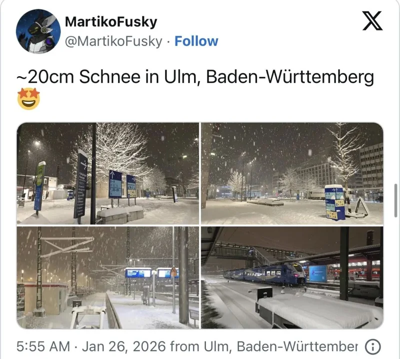 德国气象局的预报显示,这次极端天气由一个"范围虽小但破坏力惊人"的低气压系统造成。该系统自周日起越过阿尔卑斯山区,一路北上,所到之处均带来强降雪。与此同时,德国东部地区则遭遇更为危险的冻雨天气,导致道路和人行道表面形成一层薄冰,行走和驾驶都极其危险。