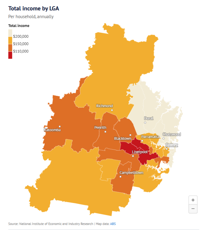悉尼的地图,不只是区名和道路。 它也是一张“家庭压力分布图”。