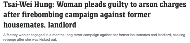 32岁的中国台湾女子洪采薇(Tsai-Wei Hung)因不满被房东与室友赶出住所,从愤怒失控,到纵火和威胁,最终让整个家庭生活在长达三个月的恐惧阴影之下。