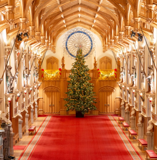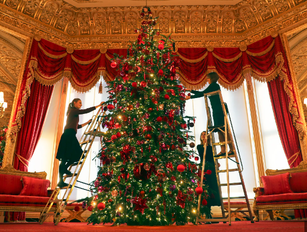 话说这英国的圣诞气氛,可是一年比一年来得早。 还没到 12 月的时候, 温莎城堡里那棵 20 英尺高的诺德曼冷杉就已经支棱起来了 —— 从温莎大公园新鲜砍来,缠上几千盏一闪一闪的小彩灯,往圣乔治大厅尽头那么一摆,气势立马就出来了。隔壁深红色会客厅里还藏着棵小一点的,也不甘示弱地发着光。