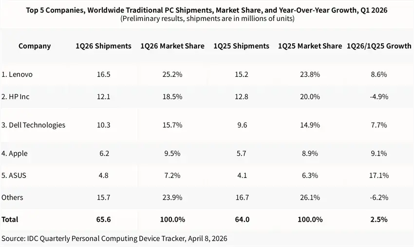 2025年,惠普过得不算差:它吃到了Windows 10换机的红利,2025年Q4出货还有两位数增长。但2026年Q1出货量(1210万台)同比下滑4.9%,市占回落到19%左右。