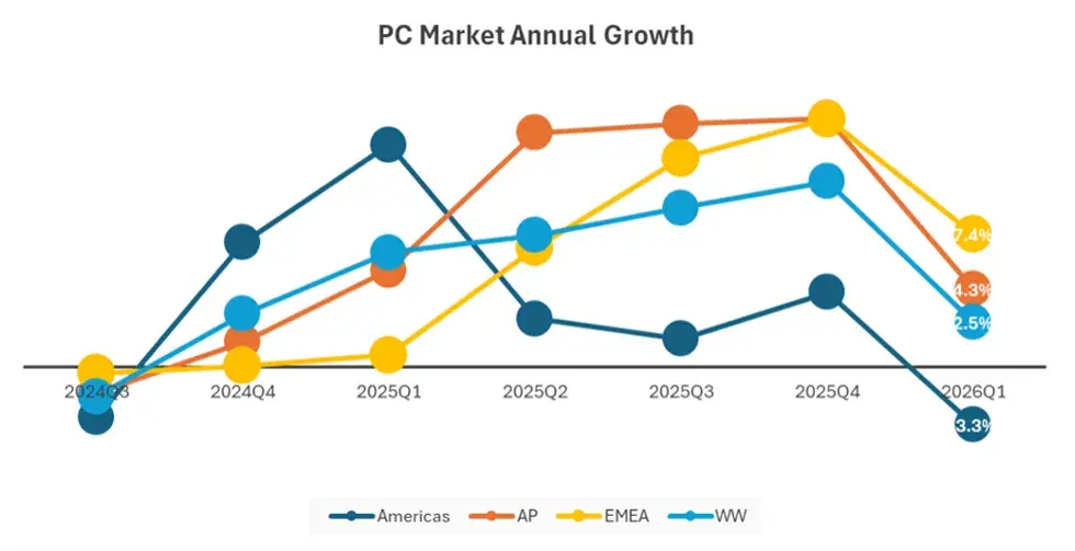 2025年Q3,全球PC市场的增速已经不低,“有‘低基数’加‘集中换机’的因素”,据PC从业者李泽分析,一方面,疫情期间透支的换机需求,导致此前基数较低,另一方面,Windows 10停止支持的时间表,迫使不少机构集中更新设备。