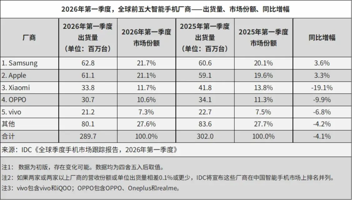 全球市场同样在洗牌。IDC数据显示,2026年第一季度全球智能手机出货2.897亿部,同比下滑4.1%,这是自2023年年中以来全球大盘首次下跌。三星重回全球第一(6280万台);苹果第二(6110万台),小米保住了第三的位置(3380万台),但它19.1%的同比跌幅也是全球前五中最大的。OPPO和vivo分列四、五名。
