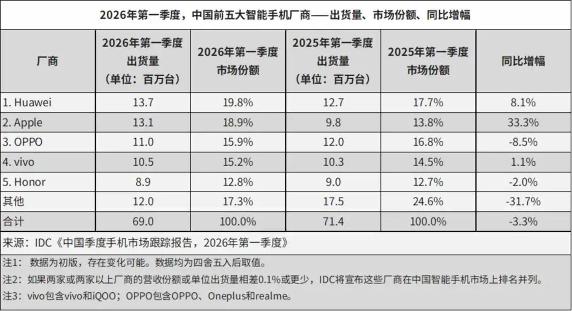 但海外战场同样不容乐观。2026年一季度,全球出货量前五的中国品牌集体承压。IDC数据显示,小米、OPPO、vivo全线下滑,三家合计减少出货近1300万台。