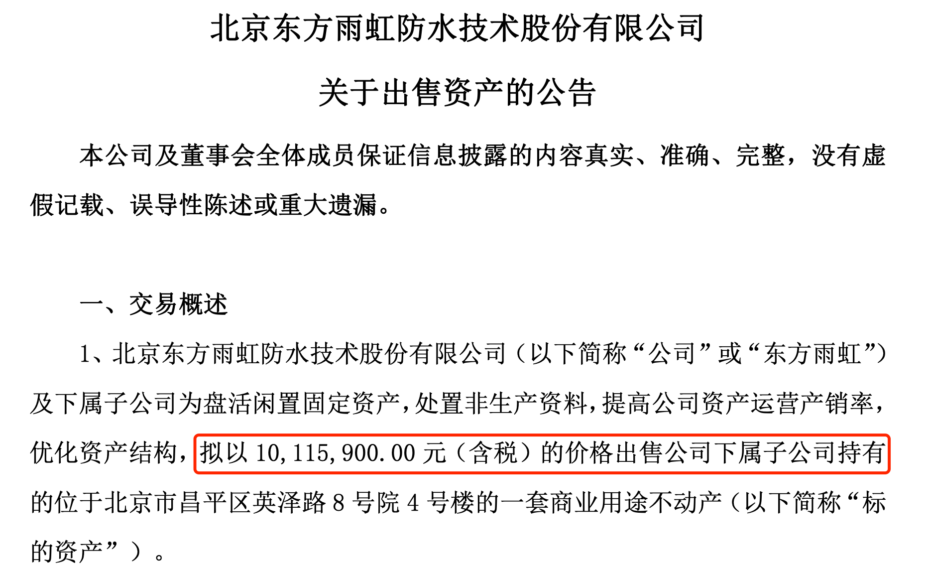 而在11月集中抛售的一个月后,东方雨虹再度“亏本卖房”。12月8日晚间,东方雨虹发布公告,拟以约1011.59万元的价格,出售其位于北京市昌平区的一套建筑面积逾千平方米的商业房产。