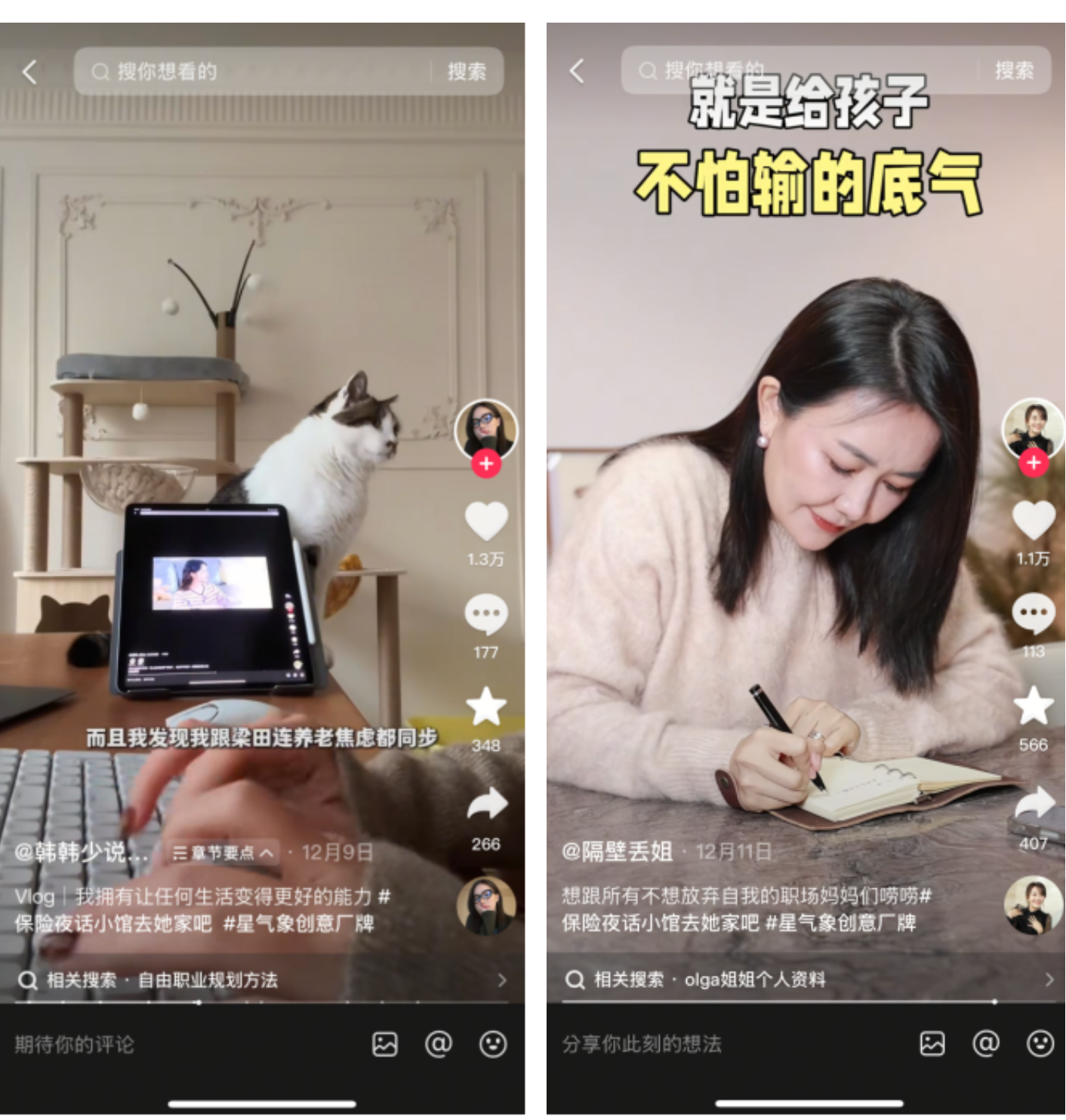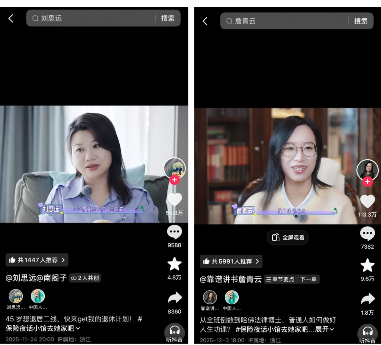 不少基于节目的二创内容,都获得了过万点赞,说明《保险夜话小馆·去她家吧》不只传递了嘉宾的人生故事、保险产品配置思路,也为人们创造了一个可延展讨论的人生话题。