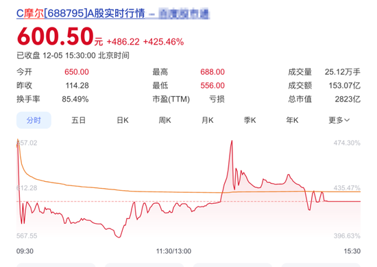 2025 年 12 月 5 日摩尔线程登陆科创板,发行价 114.28 元 / 股,开盘大涨 468.8%,盘中最高触及 688 元 / 股,收盘市值达 2822.5 亿元(部分信息显示为 2800 亿元)。按收盘价计算,沛县乾曜持有的 1699.87 万股估值达 118.98 亿元,初始 190 万投资的回报倍数飙升至6262 倍,成为人民币基金史上罕见的 “千倍回报案例”。