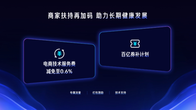 会上,抖音电商还发布两项重磅惠商举措,助力更多商家享受技术发展带来的红利。一是减免电商技术服务费,使用 “ 千川・乘方 ” 产品的所有订单,技术服务费减免至 0.6% ;二是推出百亿优惠券补贴计划,通过智能优惠券形式精准触达目标用户,直接提升转化效率,为商家创造更稳定的经营收益。