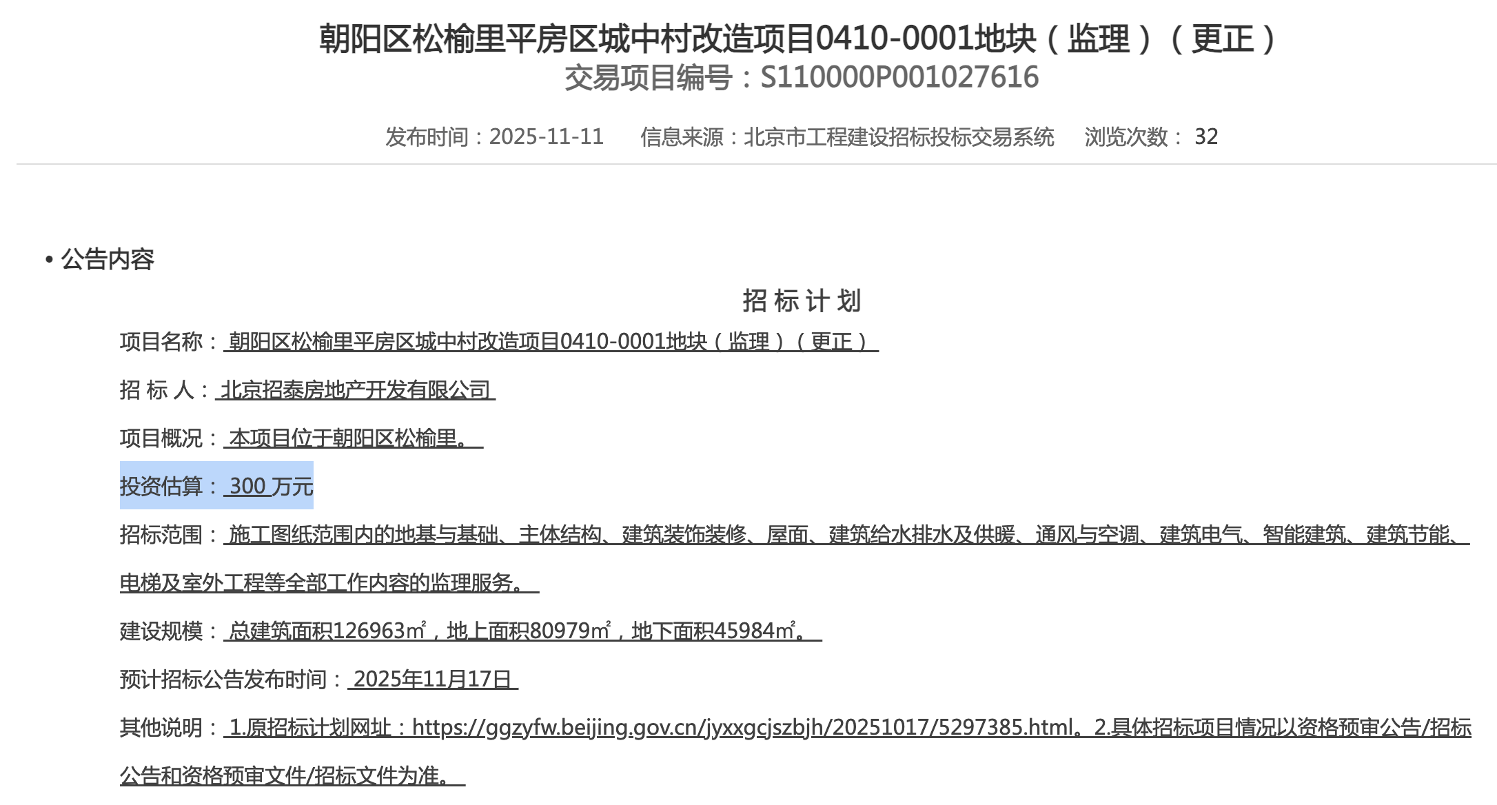 北京进深 徐迪 11月11日,招商蛇口更正了朝阳松榆里地块监理费用的招标计划。